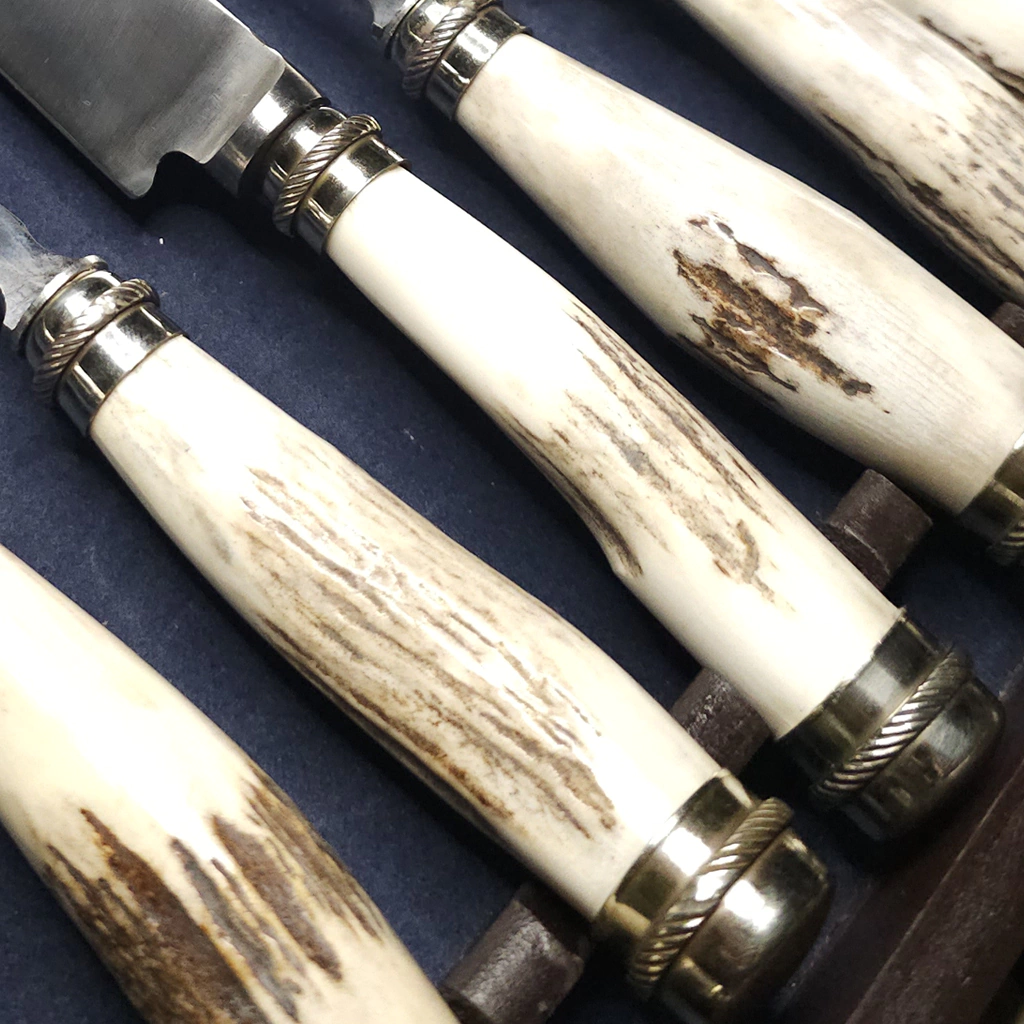 Este extraordinario juego de cubiertos, disponible en opciones de 6 comensales (12 piezas), 12 comensales (24 piezas), 18 comensales (36 piezas) o 24 comensales (48 piezas), ha sido elaborado con astas de Ciervo. Cada pieza refleja la autenticidad y la fuerza de la naturaleza, aportando una textura única y un diseño que destaca por su exclusividad.
