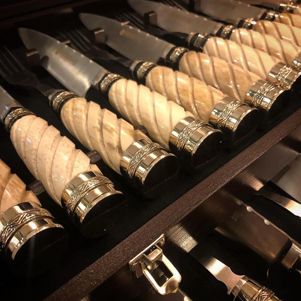 Este distinguido juego de cubiertos, disponible en presentaciones de 6 comensales (12 piezas), 12 comensales (24 piezas), 18 comensales (36 piezas) o 24 comensales (48 comensales), ha sido elaborado artesanalmente con hueso canilla de potro, un material noble que refleja la tradición y el saber hacer de la cuchillería fina argentina.